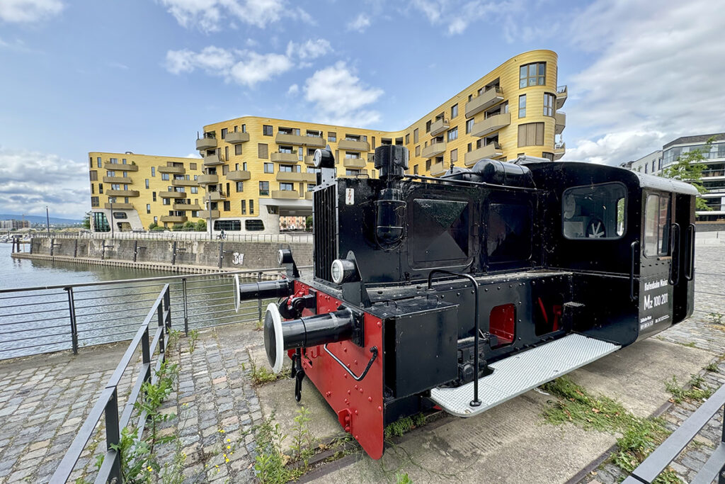 Im Zoll- und Binnenhafen, der seit 2011 nicht mehr kommerziell genutzt wird, entstand in den letzten Jahren ein ausgedehntes Wohn- und Bürogebiet mit architektonisch ansprechenden Gebäuden, einem Freizeithafen, einem Hotel, Restaurants und Cafés, Einkaufsmöglichkeiten und einem Straßenbahn-Anschluss. An die ehemalige Hafenbahn, die über ein großes Gleisnetz die einzelnen Hafenbecken erschloss, erinnern heute nur noch wenige Schienenreste im Straßenpflaster. Und eine Rangierlok des Typs Köf II vor dem PANDION DOXX, einem mit goldglänzenden Metallschindeln verkleideten Wohnkomplex. Die Köf – die Abkürzung steht für Kleinlokomotive mit Ölmotor und Flüssigkeitsgetriebe – steht erst seit November 2023 wieder im Zoll- und Binnenhafen: Zuvor war sie in der Bahnwelt Darmstadt-Kranichstein restauriert und neu in Schwarz und Rot lackiert worden. Vor der goldenen Hintergrund-Kulisse ist sie jetzt Hingucker und beliebter Selfie Spot zugleich.