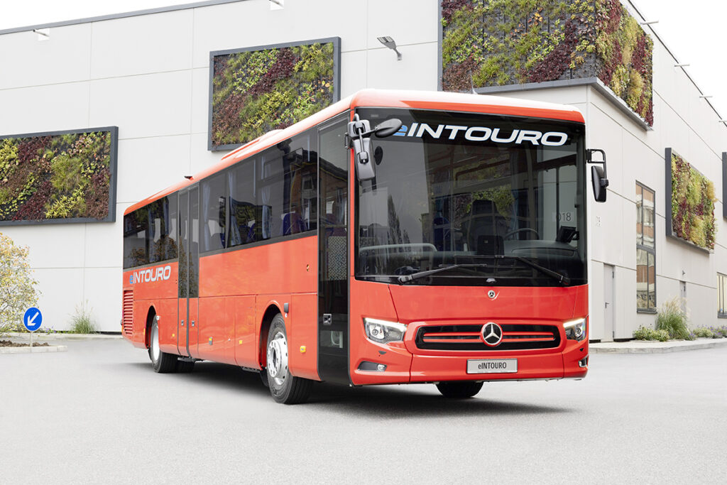 Mit dem eIntouro stellt Daimler Buses erstmals einen vollelektrischen Überland-Serienbus vor. Das Fahrzeug basiert auf dem bekannten, dieselgetriebenen Intouro, verfügt aber über einen batterie-elektrischen Antrieb mit LFP-Batterien (Lithium-Eisenphosphat-Akku) und Zentralmotor. Damit können erstmals auch Überlandlinien, Schulbus-, Shuttle- und Ausflugsverkehre sowie kürzere Reisen elektrisch betrieben bzw. durchgeführt werden. Zwei Längen stehen zur Wahl: der eIntouro mit 12,18 m und der 13,09 m lange eIntouro M. Ebenfalls neu: Im eIntouro lassen sich – erstmals in einem europäischen Omnibus – Software-Updates „Over-the-Air“ und damit ohne Werkstatt-Aufenthalt installieren.