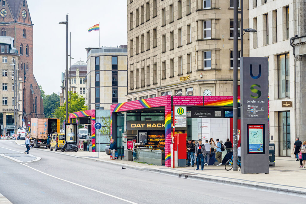 Die Hamburger Hochbahn AG (HOCHBAHN) schafft im Rahmen der Pride Week und der zugehörigen Aktion „Hamburg zeigt Flagge“ Sichtbarkeit und setzt ein klares Zeichen für die Akzeptanz und den Schutz der LGBTQIA+-Community. Seit dem 25. Juli 2025 sind die Dächer der beiden U-Bahn-Haltestellen-Zugänge am Jungfernstieg mit einer auffälligen Pride-Beklebung versehen, die die HOCHBAHN-Kampagne „Sei Du. Sei Wir.“ konsequent unterstreicht.