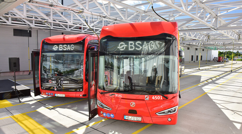 Die Bremer Straßenbahn (BSAG) hat ihren ersten kompletten Betriebshof für den Elektrobus-Betrieb aus- und umgerüstet. Schon bald sollen die ersten von 50 neuen E-Bussen starten …
