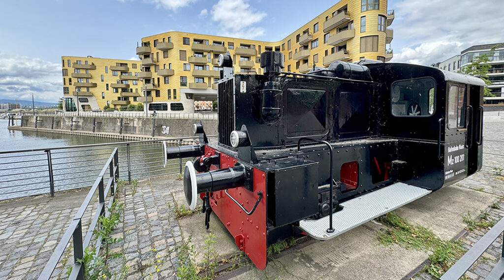 Wer am Mainzer Rheinufer flussabwärts spaziert, erreicht schon bald den alten Zoll- und Binnenhafen – heute ein attraktives Wohn- und Bürogebiet. Eine alte Rangierlok erinnert an frühere Zeiten …