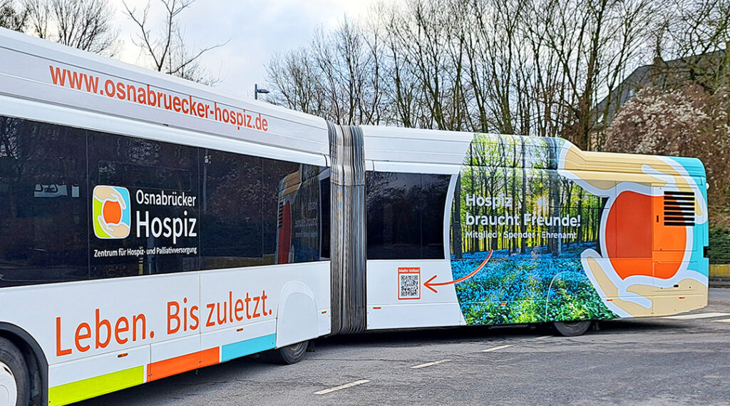 Der Verein Osnabrücker Hospiz hat eine kostenlose Buswerbung bei den Stadtwerken Osnabrück (SWO) gewonnen. Auf einem Gelenkbus werden nun ein Jahr lang die Angebote des Vereins vorgestellt.